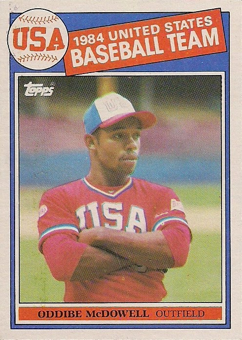 What a card: Oddibe McDowell is the eighth of 11 '84 U.S. Baseball Team members shown so far to have reached the majors. In fact, McDowell was already in major league baseball when this card was issued. He is the only player featured in this set to also have another card in the Traded set.