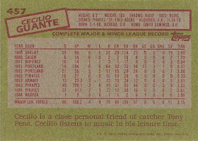 What a card: Cecilio Guante was entering what would be the most productive season of his career when this card was issued. After appearing in just 27 games in 1984, Guante would appear in 63 in 1985 and strike out 92.